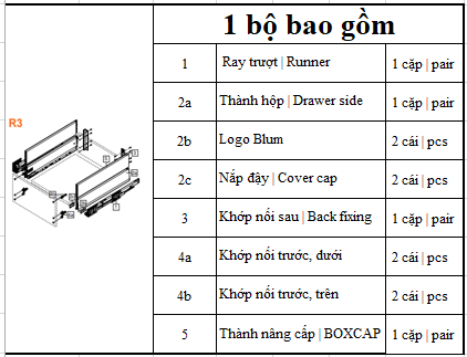 | Mã ray hộp R3 màu xám nhạt : 5181038 Đơn vị tính: Bộ (thành hộp+ray trượt) Bảo hành: Trọn đời(công năng) Thương hiệu: Blum Xuất xứ: Áo Liên hệ 0987394144 để được tư vấn chọn sản phẩm phù hợp Hổ trợ giao hàng toàn quốc |