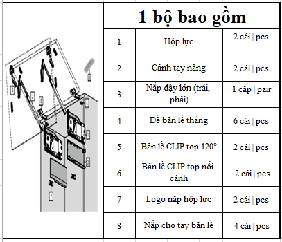 | 78Z5500T32 | 7292028 | Bao gồm: -1 bản lề 120º -1 bản lề nối cánh 134º -2 đế bản lề thẳng -2 nắp đậy tay bản lề |